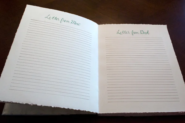 *All baby books come with a set of standard pages. They are: Quotation, Family Tree, Letter from Mom and Dad, Hand and Footprints, Birth Certificate, Growth Charts and Memorable Firsts. This leaves 48 blank pages for pictures. If you'd like to order a custom baby book please contact Pen & Hand for pricing and customization options.
